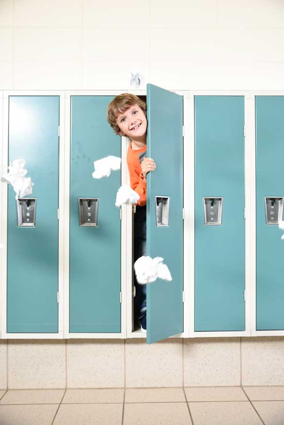 Kade was a trooper with our crazy ideas. We asked this 8-year-old to break the rules for an hour and climb inside a locker at General Beadle Elementary school. He thought we were joking! But the crazy didn’t end there. We asked Becky, his mom, to throw paper airplanes at him and school supplies in front of him. And alas, we ended up with the perfect cover for our Back to School fall issue of BHParent magazine.